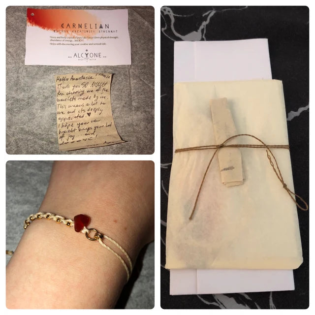 Bought this for my fiancée to wear on our wedding day, for calm and guidance, and to match my own collection. Lovely and well made bracelet with a positive and thoughtful handwritten note, as well as a special talisman gift after all my orders lately!! Thank you aga 🧡